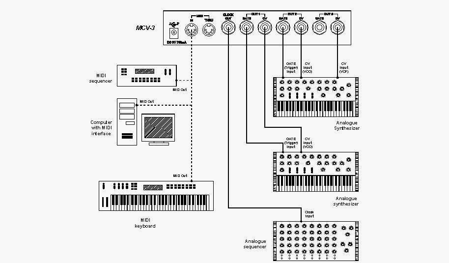 MCV-3 może współpracować praktycznie z każdym tak wyposażonym analogiem. Wyjścia CV konwertera mogą dostarczać napięcia sterujące zarówno w liniowym standardzie V/oct, jak też i wykładniczym Hz/V. System V/oct stosowany był w syntezatorach firm: Moog (podstawa standardu), ARP, E-mu, Sequential Circuits (Pro-One), Roland (System 100M, seria SH) i wielu innych. Stosowany jest również we współcześnie produkowanych syntezatorach analogowych i należy uznać go za system dominujący. System Hz/V stosowany był w syntezatorach firmy Korg (m.in. seria MS) i Yamaha (seria CS), a także w kilku innych modelach mniej znanych firm. Wyjścia GATE konwertera mogą dostarczać sygnałów zarówno aktywnych typu GATE (+5V i +10V), jak i pasywnych (zwarcie do masy) S-Trigger. Możliwość pracy wyjść GATE w trybie Reverse (odwróconym) pozwala również na współpracę z bardzo nietypowymi pod względem wymagań wejściami Trigger, używanymi w syntezatorach serii CS firmy Yamaha.